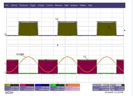 为满足这个要求,IGBT可在20kHz或以上频率的情况下,对50Hz或60Hz的频率进行脉宽调制,因此输出电感器L1和L2便可以保持合理的小巧体积,并能有效抑制谐波。此外,由于其转换频率高出人类的正常听觉频谱,因此该设计也可尽量减少逆变器产生的可听噪声。