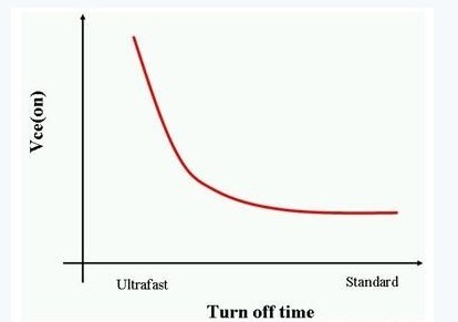 IGBT基本上是具备金属门氧化物门结构的双极型晶体管 (BJT) 。这种设计让IGBT的栅极可以像MOSFET一样,以电压代替电流来控制开关。作为一种BJT,IGBT的电流处理能力比MOSFET更高。同时,IGBT亦如BJT一样是一种少数载体元件。这意味着 IGBT关闭的速度是由少数载体复合的速度快慢来决定。此外,IGBT的关闭时间与它的集极-射极饱和电压 (Vce(on)) 成反比(如图3所示)。
