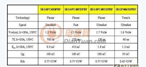 表1显示了四个拥有相同尺寸的IGBT的参数值。前三个IGBT采用同样的平面式技术,但使用不同的寿命复合控制计量。从表中可见,标准速度的IGBT具有最低Vce(on) ,但与快速和超速平面式IGBT相比,标准速度的IGBT下降时间最慢。第四个IGBT是经优化的槽栅IGBT,能够为太阳能逆变器这类高频率切换应用提供低导通和开关损耗。请注意,槽栅IGBT的Vce(on) 和总切换损耗 (Ets) 比超速平面式IGBT低。