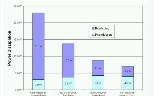前文讨论了高压侧 IGBT在20kHz或以上频率进行切换。假设设计一个拥有230V交流输出的1.5kW 太阳能逆变器,表1中哪种IGBT具有最低的功耗呢?图4显示了IGBT在20kHz进行切换的功耗分析,由此可见超速平面式IGBT比其它两种平面式 IGBT具有更低的总功耗。