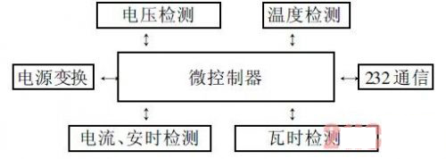 数据采集系统硬件结构如图2所示, 主要包括以下几个模块:微控制器、电源模块、电流及安时检测???、瓦时检测???、电压检测??橐约巴ㄐ沤涌诘缏?。