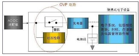 根据YD/T 1591-2006标准,手机侧充电控制电路应具备过压保护装置,也就是在手机充电接口导入直流6 V以上电压时,如果不能保证安全充电,应启动?;?,在非预期电压的情况下,不应出现过热、燃烧、爆炸以及其它电路损坏的现象,而且恢复后,手机应能正常工作。如图4所示,过压保护(OVP)电路在检测到过压故障状况时,检测电路就会将开关打开,使电子负载与电源断开,从而使得包括微处理器、射频、存储器和电源管理器件等核心芯片遭受过压损伤。