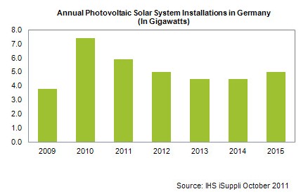 据IHS iSuppli公司的光伏市场研究,在经历了7、8月份的低迷后,全球最大的光伏安装市场德国有望于10月和11月迎来光伏系统订单的增长,这是由于德国可能在明年一月份下调上网电价。上网电价的下调将刺激太阳能安装量,投资者和业主们都在抓紧机会下订单。