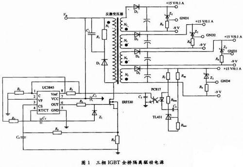 三相IGBT全桥隔离驱动电源采用电流型PWM控制器LIC3845,输出4路相互隔离的+15 V/-9 V,如图1所示。其中,一路额定输出电流为0.2 A,用于三相全桥下桥臂共射极连接的3个IGBT的驱动供电,另外3路额定输出电流为0.1 A,分别用于上桥臂的3个IGBT的驱动供电。