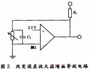 变压器+15 V,-9 v/0.2 A一路输出电压通过TL431a和光耦PC817反馈到UC3845的1脚,UC3845的2脚接地,UC3845内部误差比较放大器的输入误差总是固定的,将PC817的光电晶体管视为可变电阻,1脚的反馈信号改变的是误差比较放大器的增益,其等效电路如图2所示。