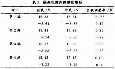对设计的电路进行实验,得出了实验数据和波形。表1为隔离电源在空载和带载(+15 V,-9 V/0.2 A一路输出带载240 Ω,另外3路输出各带载120 Ω)下的4路输出电压值及相应的负载调整率。