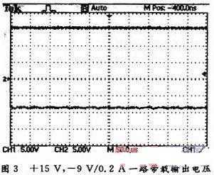 图3为+15 V,-9 V/0.2 A一路输出带载时的电压波形。图3为+15 V,-9 V/0.2 A一路带载输出电压:深色CH1为+15 V输出,浅色CH2为-9 V输出。