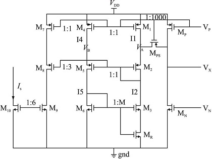 根据系统设计要求, 电流检测的比例应该为K = 1 000:1, 电路图中给出了各级电流复制的比例,由于电流检测电路采用带反馈控制、电阻值可变的电流源结构, 可以得到VA 等于VB, 又由于设置M1,M4, 和M7 的宽长比相等, 根据MOS 电流公式可以得到:
