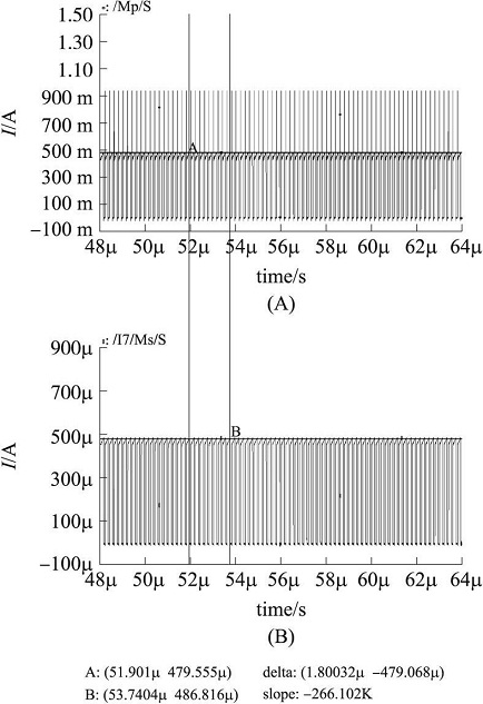 检测精度和速度是电流检测电路两个重要的指标。由于每个检测周期的开始阶段, 电流检测电路处于启动状态, 所以Is 都有一段启动时间。这个时间主要由电路中M9、M10管的寄生电容决定, 当两管的宽度和长度比较小时, 启动时间很短, 相反, 启动时间会变长。为了保证电流检测的精度, M9、M10两管的L 不能太小, 现取1 um。