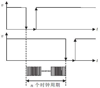 当无运动物体遮挡光电开关时,光电开关的接收端输出高电平信号,当有物体经过遮挡时,光电开关的接收端输出低电平信号。即当高速物体经过一对光电开关时会先后形成2 个高电平到低电平的脉冲信号。通过计时周期的方式测出这2 个下降沿之间的计数周期个数n,计时原理如图1 所示。
