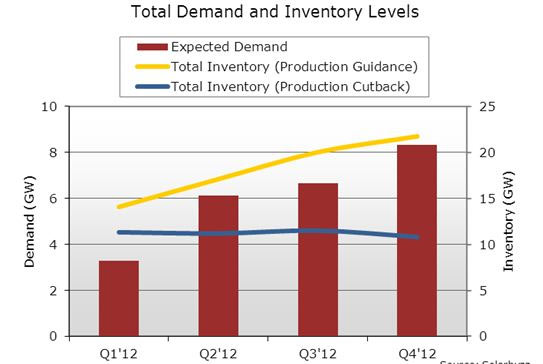 Q1’12-Q4’12全球光伏需求与电池片/组件库存比较