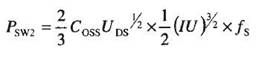 式中 I 为 正向电流有效值,RDS(on)为通态电阻,fS为开关频率,CGSS为输入电容,Coss为输出电容,D为占空比??杉?,正向导通损耗与RDS(on)成正比。不同VDS的MOSFET, RDS(on)往往可相差几个数量级,所以相同电路拓扑中采用100V MOSFET的损耗比采用200VMOSFET明显要低??悸堑降蚔DS的MOSFET比高VDS MOSFET的Coss要小,据关断损耗式,表明低VDSMOSFET的关断损耗也小。驱动损耗式为开关过程中输入电容充放电引起的损耗,该损耗与栅一源驱动电压的平方成正比。由于采用了两级变换器,对隔离级来说,因稳压级己经将较宽的输入电压稳在固定的中间总线电压上,变压器的变比可以达到最佳。