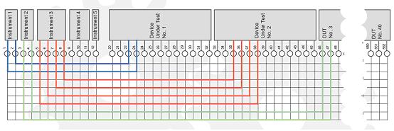 可以选择另一种方式对矩阵进行配置,这种方式可以得到更为高效,并且Pickering公司的BRIC也非常适用在这种方式中。前面提到的矩阵构成方式是,将测试装置和Y向进行连接,将待测设备的接入点和X向进行连接,下面我们采用另一种方式重新对矩阵进行排列,将所有的测试装置以及待测设备的接入点都和X轴向进行连接。而Y轴则是将X轴方向上的不同设备进行相互连接。尽管在许多应用中,如果PXI的前面板上有需要的话,Y轴是可用的,但是Y轴的输出并没有用到。