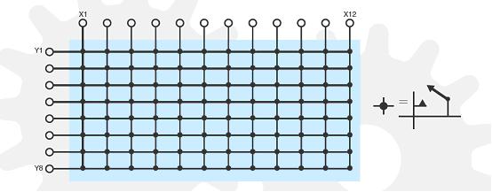 实现开关切换的一个比较通用的方法就是采用交叉点开关或矩阵排列来实现。在矩阵开关中,一系列的横向(X轴方向)和纵向(Y轴方向)线路在每个交叉点上相互连接着??刈罴虻サ慕峁故?,在通常的状态下是???,而在上电后则断开连接,形成闭合状态,但是,也可能存在其他的结构。开关允许矩阵中任何横向线路与纵向线路在任意点的连接。