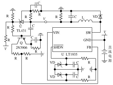 本文设计的非隔离负电压DC/DC开关电源如图4所示,负电源工作在连续电流模式。当电源控制器LT1935内部的功率三极管导通时,直流电源给输出电感L1和输出电容C1充电。当电源控制器LT1935内部的功率三极管关断时,输出电感L1中的电流改由通过肖特基二极管VD1提供的低阻抗回路继续给输出电容C1充电直至下一个周期电源控制器LT1935内部的功率三极管再次导通。可见电容C1在输出电感L1储存能量和释放能量的过程中均获得充电,从而减小了输出纹波电压。同时,在CCM条件下,输出电流在LT1935内部功率三极管的导通和关断期间均通过输出电感L1,这很大程度上抑制了输出电流的波动,降低了输出纹波电流的影响,进而大大增加系统的带负载能力和效率。