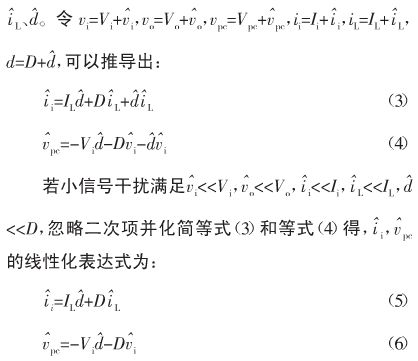 图6给出图5利用平均电路法建立的非隔离负电压Buck开关电源CCM大信号模型。设Vi为输入电压的稳态值,Vo为输出电压的稳态值,Vpc为受控电压源两端电压的稳态值,Ii为输入电流的稳态值,IL为输出电感电流的稳态值,D为占空比的稳态值。