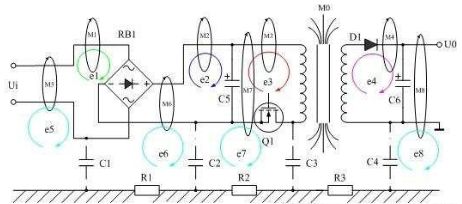 图1是磁感应产生传导干扰的原理图,图1表示开关电源变压器产生的漏磁通穿过其它电路时,在其它电路中也产生感应电动势,其中漏磁通M1、M2、M3产生的感应电动势e1、e2、e3属于是差模干扰信号;M5、M6、M7、M8产生的感应电动势e5、e6、e7、e8属于是共模干扰信号。