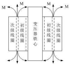 图2是开关电源变压器产生的漏磁通的原理图??氐缭幢溲蛊鞯穆┐磐ù笤荚?%~20%之间,反激式开关电源变压器为了防止磁饱和,在磁回路中一般都留有气隙,因此漏磁通比较大,即:漏感比较大。因此,产生漏感干扰也特别严重,在实际应用中,一定要用铜箔片在变压器外围进行磁屏蔽。从原理上来说,铜箔片不是导磁材料,对漏磁通是起不到直接屏蔽作用的,但铜箔片是良导体,交变漏磁通穿过铜箔片的时候会产生涡流,涡流产生的磁场方向正好与漏磁通的方向相反,是部分漏磁通被抵消,因此,铜箔片也可以起到磁屏蔽的作用。