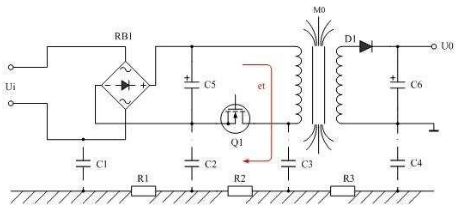 值得一提的是,开关电源变压器初级线圈的漏感产生的反电动势et,在所有干扰信号之中是最不容忽视的,如图3所示。当电源开关管关断的时候,开关电源变压器初级线圈的漏感产生的反电动势et几乎没有回路可释放,一方面,它只能通过初级线圈的分布电容进行充电,并让初级线圈的分布电容与漏感产生并联谐振;另一方面,它只能通过辐射向外进行释放,其中通过对地电容C3与大地相连,也是反电动势et释放能量的一个回路,因此,它对输入端也会产生共模信号干扰。