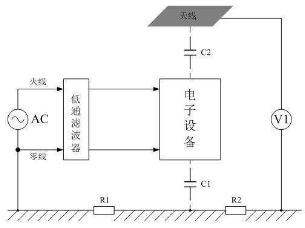 辐射干扰一般是通过电磁感应的形式在空间进行传播的,图4是测试电子设备产生辐射干扰的基本方法,或表示电子设备产生的干扰信号通过电磁感应向空中辐射的原理。图4中,电子设备表示干扰信号源,V1表示测量仪表,C1表示电子设备对大地的电容,C2表示电子设备与天线偶合的电容,即:电子设备通过电场对天线产生感应,这里的天线也可以看成是被干扰的设备。图4的测试方法就是测试电子设备周围规定距离某处的电磁场强度,由于干扰信号一般都是一个频率成份非常丰富的非正弦波,因此,无法对它进行直接测量,只能对它其中某一个频率信号单独进行测量。