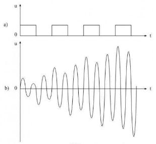 图6是谐振回路产生谐振的工作原理图。图6-a)是一个含有谐波分量非常丰富的电压方波,图6-b)是LC串联回路产生谐振时的电压波形。当电压方波作用于LC串联回路时,方波的前后沿都会对LC串联回路产生激励(即接收能量),每次激励过后又会产生阻尼振荡(即损耗能量),当输入电压波形的上升率dv/dt值大于谐振回路波形(正弦波)的上升率时,电路就会产生激励;当输入电压波形的上升率dv/dt值小于谐振回路波形的上升率时,电路就会产生阻尼。