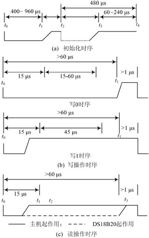 (1)初始化时序。时序见图2(a),主机总线t0时刻发送一复位脉冲(最短为480s的低电平信号)接着在t1时刻释放总线并进入接收状态,DS18B20在检测到总线的上升沿之后等待15~60μs,接着DS18B20在t2时刻发出存在脉冲(低电平持续60~240s),如图中虚线所示。