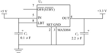 由于nRF2401的供电电压范围为1.9~3.6V,而AT89S51单片机的供电电压是5V,为了使芯片正常工作,需要进行电平转换和分压处理,设计采用MAXIM公司的MAX884芯片进行5V到3.3V 电平转换,如图5所示。
