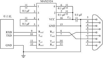 串口是计算机上一种非常通用设备通信的协议,大多数计算机包含2个基于RS232的串口,PC的串行口是RS232C电平,而单片机的串行口是TTL电平,两者之间通过串口通信时,必须进行电平转换,设计运用MAX232A芯片完成单片机与PC之间的数据传输,硬件连接电路如图6所示。