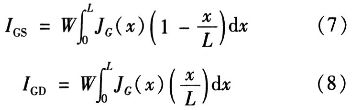 其中,JG是栅极电流密度,L是沟道长度,W是沟道宽度,x是沿沟道的位置(源极处x=0,漏极处x=L),IGS和IGD是栅极电流的栅/源和栅/漏分量。通过线性化栅电流密度与位置的关系,简化这些等价噪声电流分析表达式,所得的总栅极电流噪声表达式为