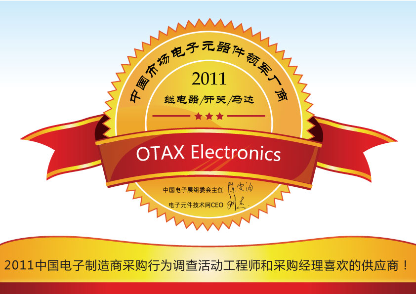 在近日刚刚结束的2011中国电子制造商采购行为调查暨中国市场电子元器件领军厂商的评选活动中,OTAX Electronics凭借持续稳定的产品、技术和服务等多方面优势,以及在工程师心目中形成的良好形象,一举荣获2011中国市场电子元器件(继电器/开关/马达类)领军厂商称号!