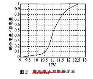 系统工作时间与电池电量成线性关系, 而电量与电池端电压为非线性关系。图2 所示为本系统所用电池在2 000 mA 恒流放电的情况下, 电池端电压与电量的关系曲线, 其中横轴为电池电压, 纵轴为剩余电量相对于总电量的百分比。根据此曲线, 在MCU 软件中拟合一个电压与电量关系的数据表, 同时设置10 V为告警电压; 系统可以实时查询诸如电池电压、电流、剩余电量、估计供电时间等信息, 并同时仿手机做成3段式显示, 使上位机全面掌握电池状态,决定控制策略, 从而提高系统运行可靠性。MCU 软件使用KeiluV2 软件开发, 上位机软件使用LabWindow s 软件开发。MCU 除完成电量查询相关功能, 还要完成报警与显示功能; 上位机软件同时要完成环境参数的相关采集与处理。