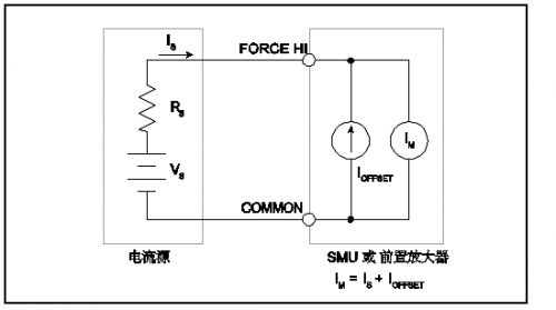 对于理想的安培计,当其输入端子保持开路时,其读数应为零。然而,现实中的安培计在输入开路时确实存在小电流。这一电流被称为输入偏移电流,是由于有源器件的偏置电流以及流过仪器中绝缘体的漏泄电流产生的。SMU内产生的偏移电流已包括在吉时利4200-SCS型的技术指标中。如图1所示,输入偏移电流增加至被测电流,所以仪表测量的是两个电流之和。