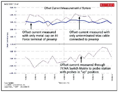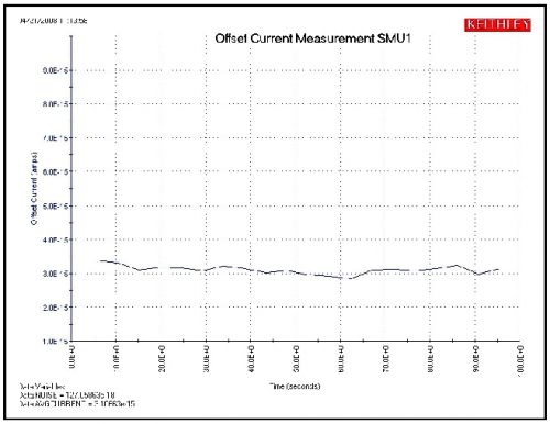 确定了安培计的偏移电流后,将系统的其余部分逐步添加至测试电路,通过重复电流(0V)和时间图,验证系统其余部分的偏移(利用图3中所示的“Append Run”按钮)。最后,在“up”位置对探针末端或未连接器件的测试夹具进行测量。该过程将有助于确定任何故障点,例如短路的电缆或测量电路中的不稳定性。然而,要意识到,连接和断开电缆都会在电路中产生电流。为了进行超低电流测量,可能有必要在改变测试电路的连接后等待几分钟至几个小时,使杂散电流衰减。图4中的图形显示的是以下条件下的偏移:1)SMU的Force HI端子上戴有金属帽;2)前置放大器上仅连接一根三轴电缆;3)通过吉时利7174A型小电流开关矩阵至探针台,“up”位置有一个探针。