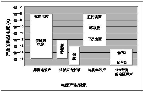 确定了电流偏移、漏流及所有不稳定性后,采取措施减小测量误差将有助于提高测量准确度。这些误差源包括建立时间不足、静电干扰、漏泄电流、摩擦效应、压电效应、污染、湿度、接地环路,以及源阻抗。图5中汇总了本节讨论的部分电流的幅值。