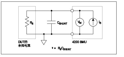 测量电路的建立时间在测量小电流和高电阻时尤其重要。建立时间是指施加或改变电流或电压后测量达到稳定的时间。影响测量电路建立时间的因素包括并联电容(CSHUNT)和源电阻(RS)。并联电容是由于连接电缆、测试夹具、开关和探针造成的。DUT的源电阻越高,建立时间越长。图6的测量电路中标出了并联电容和源电阻。