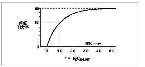 因此,读数稳定至最终值的1%所需的建立时间为τ的5倍,也就是50秒。图7所示为RC电路的阶跃电压指数响应。经过一个时间常数(τ = RC)后,电压上升至最终值的63%。