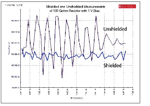 当带电物体接近被测电路时,会发生静电耦合或干扰。低阻抗时,由于电荷消失很快,所以干扰的影响不明显。然而,高电阻材料不会使电荷快速衰减,则会造成测量不稳定、噪声很大。通常情况下,当被测电流≤1nA或者被测电阻≥1GΩ时,静电干扰就会成为问题。