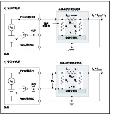 在图11b中,金属安装板被连接至SMU的?;ざ俗?。隔离绝缘体顶部和底部的电压接近相同电势(0V压降),所以在隔离绝缘体中就不会有漏流影响测量准确度。由于金属安装板将处于保护电势,所以为安全起见,金属屏蔽必须连接至地。