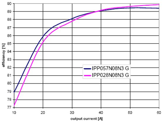 图8表明了在实际应用中,不同MOSFET RDS(on) 值范围的影响。图中所示为在服务器电源中分别测得的IPP028N08N3 G和IPP057N08N3 G的值。