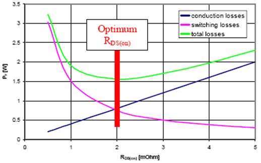当RDS(on)在1毫欧姆至3毫欧姆范围内时,总功耗始终大致相同。但是,在1毫欧姆以下,RDS(on)仅下降0.5毫欧姆,便会令总功耗提高一倍,从而严重降低电源转换器的效率。