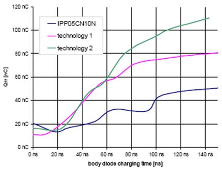 对于优化能效,MOSFET内部的体二极管具有关键作用。在每个开关循环中,在MOSFET被关断之前,体二极管通?;嵬ǖ纾聪蚧指吹绾蒕rr*也由此积聚起来。在第3节中已经提到,数据手册中所载Qrr与实际Qrr*有所出入。数据手册中的值是按di/dt为100 A/μs测得的,二极管被施以最高漏极电流,并且MOSFET关断前的导通时间长达500 μs左右甚至更长。因此,所测得的值是尽可能最高的Qrr*。此外,JEDEC标准所规定的测定方法不仅包含了Qrr*,而且包含MOSFET的部分输出电荷,因而得到的总值很高,与实际值不相符。需要强调的是,虽然在实际应用中,di/dt可能高达1000 A/μs,并且di/dt越高,Qrr*也越高。但是,Qrr*主要取决于电流和二极管导通时间。由于在实际应用中,电流仅为最高漏极电流的一半甚或更低,并且二极管导通时间仅为50 ns至150 ns,因此实际Qrr*值比数据手册中的值低得多。