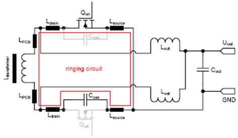 并且,环路的寄生电阻会抑制振荡(Coss = MOSFET的输出电容, Lstray = Lsource + Ldrain + LPCB + Ltransformer)。仅当二次侧的环路电感限制了电流换向时,此处讨论的波形形状才有效。这就意味着,限制di/dt的不是一次侧MOSFET的开启速度,而是电源的二次侧的杂散电感。