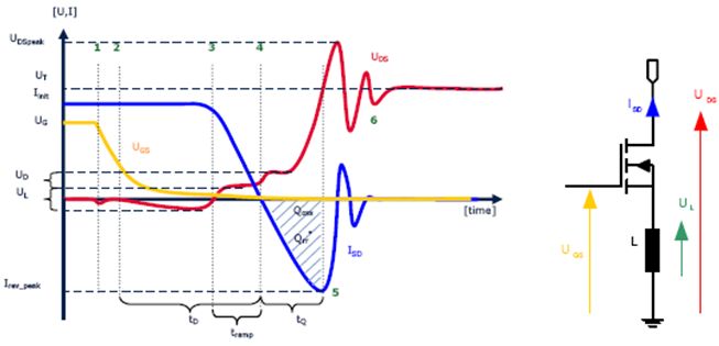 分析首先从开关的导通状态开始:此时,栅极电压很高,漏源电压几乎为零,电流从源极流向漏极。在点1时,栅极被关断。在UDS波形中,这表现为栅极电容CG放电产生的负电压骤降很小。此放电会在MOSFET的源极连接处产生具有大的电流变化(di/dt)的电流峰值。在感应作用下,源极的这种电感会引起UDS波形发生压降。