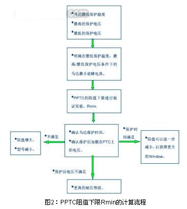 其次确认PPTC的阻值下限Rmin。下图2为PPTC阻值下限Rmin的设计流程。