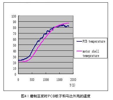 用上文所述的PPTC设计流程可以用在多功能豆浆机马达防堵?;ど杓浦?,但这是往往会碰到选择PPTC型号困难的问题,也就是说多功能豆浆机的马达?;ど杓苹峤掀胀ǖ男〖业缏泶锉;じ丛拥亩?,图4为磨制豆浆时PCB板周围环境温度和马达外壳温度的实测图,可见控制电路PCB板PPTC周围的环境温度最高可以到达85C。由于豆浆机的PPTC最高环境温度85度会比普通的小家电最高环境温度要求高,这样既要在85度的最大工作电流下能正常工作,还要保证在最低温度0度的堵转电流情况下能及时的?;?,相应的就增大了设计难度。下面就具体的阐述此类多功能豆浆机马达堵转的?;ど杓品桨?。