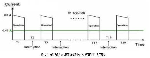 以磨制豆浆时的电流确定最大工作电流,根据该最大工作电流和最大环境温度初步确定TE connectivity LVR系列PPTC的相关型号。图5为多功能豆浆机磨制豆浆时的工作电流,测得多功能豆浆机的直流马达的最大电流为800mA,由于磨制豆浆时马达是间隔一定时间工作的,并不是一直连续工作的,间隔时间由豆浆机MCU计时电路控制,所以计算PPTC要能维持的最大工作电流指的是马达工作整个周期的平均电流,图中所示的800mA的最大电流换算成在一个完整工作周期内为450mA。查阅LVR100在85度下的hold电流大约是550mA,所以首先选取 LVR100。