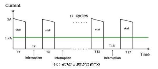 图6为多功能豆浆机的堵转电流。在榨水果的堵转情况下,实测马达的堵转最大电流为2A,由于榨果汁时马达也不是一直连续工作的,也是间隔一定时间工作,间隔时间是马达工作6S,停3S,这样换算成在一个榨水果完整工作周期内平均电流是1.6~1.7A。在1.6~1.7A堵转电流下,马达堵转需要?;さ氖奔湟笤?50S内。