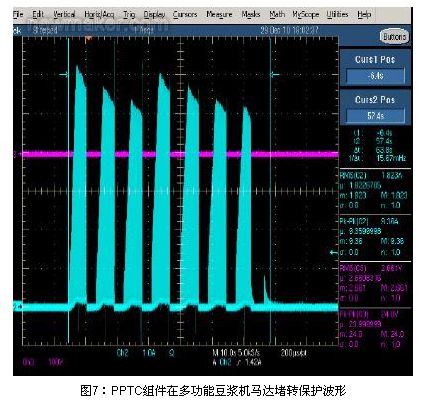 由于在使用多功能豆浆机时,豆浆机往往在制作果汁的时候会发生堵转,马达的堵转指的是杯体中的物品将马达轴承固定不使其转动,这时电压还加在马达的两端,这时候的电流就是堵转电流,一般的马达都是不允许发生堵转的,因为马达发生堵转之后马达线圈的温度会急剧上升,温度超过线圈的最高温度之后,时间稍长就会烧坏马达,这即增加了消费者的不便,也增加了生产者的维修成本。所以在豆浆机中增加马达?;ぷ爸檬潜夭豢缮俚?,而且是在堵转消除后能自动恢复的保护,因此选择TE connectivity公司的可恢复PPTC是一个不错的解决方案。