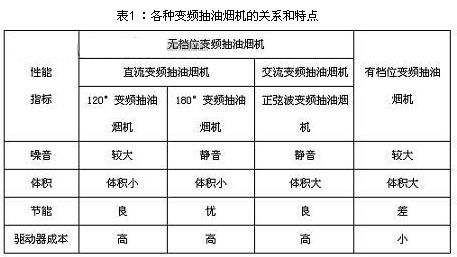 抽油烟机变频的目的是为了通过调整抽油烟机上的带动风扇的电机转速,进而根据油烟量的大小调整油烟抽吸的快慢。优良的调速和节能效果使得变频抽油烟机在性能上明显优越于传统的抽油烟机,而变频抽油烟机根据具体的变频技术有不同的分类和性能特点,如表1所示。