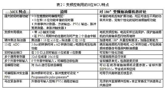 此外,这些MCU还具有带2个自由中断专用变频控制???,以在PWM周期的任意时刻产生中断,根据用户需要的任意时刻对电流进行采样;专用于控制 PWM高阻态输出的独立外部信号输入,可在非正常情况下快速停止风扇的转动;以及8位的可编程死区控制(死区时间范围:0.1 s~25.6 s)等。图2显示了8位变频控制MCU的主要特点,表2则这些功能给出了详细说明。